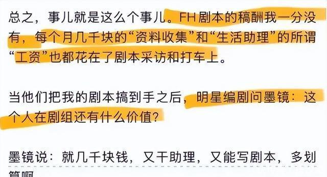 抛开这次事件的对错真假不提,不可否认,娱乐圈里确实一直有这样的潜规则。 很多不知名的小编剧,刚刚入行的时候,都只能给那些大编剧们当枪手。 他们帮助成名编剧丰富剧本架构、添加细节,但拿着很少的薪酬,还没有署名权。 有人熬过来了,有名气了,可能就能留下自己的作品,还有很多的熬不下去就默默转行了。