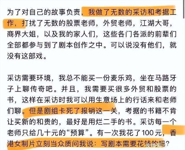 这么看来,要是没有古二奠定的良好基础,也就没有如此精彩的繁花故事。 那么,他获得了什么呢? 一是,无情的压榨。 有经济上的。 古二说,他做了很多采访和考据工作,买了很多书籍,打扰了很多相关行业的从业老师。 但这些都没有得到剧组的资金支持,哪怕只是报销100块,都会被冷嘲热讽。