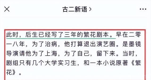 这人从两年前就在公众号上发表文章,长期对《繁花》的编剧署名表达不满,后来还公开了几段录音,就为证明自己所言非虚。 根据古二本人的描述,早在2018年,他就接触到了《繁花》剧组和王家卫导演。 作为 渐冻症患者 ,为了治病,他已经考虑退圈不写了,但看在王家卫的面子上,才留在了剧组里,和几个实习生一起研究原著。
