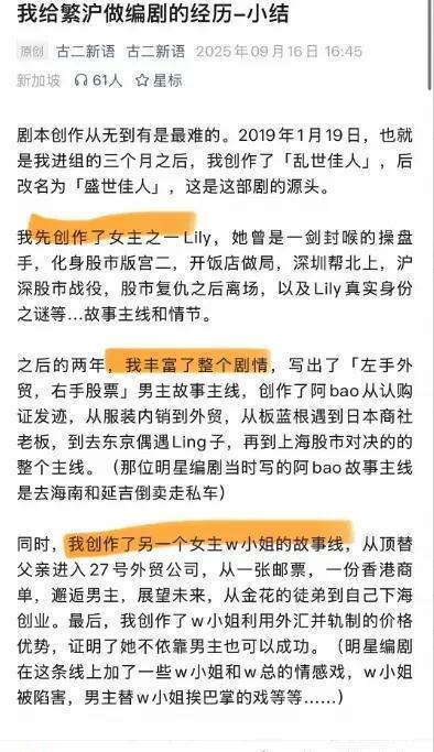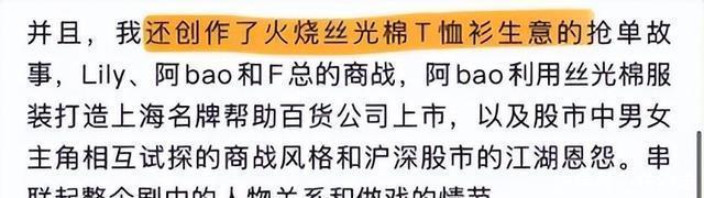 2019年1月,他开始从无到有的创作。 Lily的复仇线是他创作的。 汪小姐的创业线是他设计的,可惜后来被加上莫名其妙的感情戏。 男主阿宝原本差点被安排去海南和延吉倒卖走私车,是他力挽狂澜,改成了金融线,从而奠定了整个故事的腔调,以及主线走向。