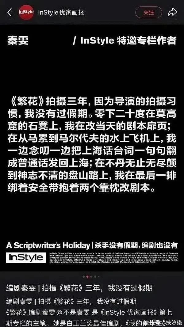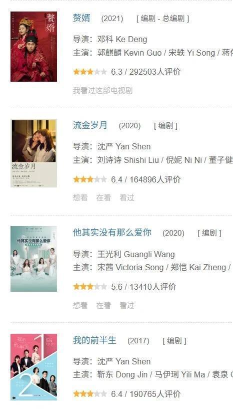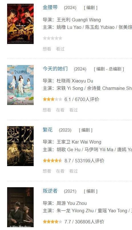 他们也觉得编剧秦雯大有问题。 一方面,秦雯在录音里表现出来的状态,确实让人怀疑她的能力是否足以完成繁花的剧本。 至少独立完成是不太可能的。 那么秦雯做了多少工作,团队做了多少工作,古二又做了多少,就很值得说说了。 另一方面,翻看秦雯过去的履历就能发现,她的涉猎相当之广,而且十分高产。 几乎每年都有她的编剧作品上映,既有《我的前半生》这样的都市生活剧,又有《赘婿》这种古装男频剧,还有《繁花》这类大戏。