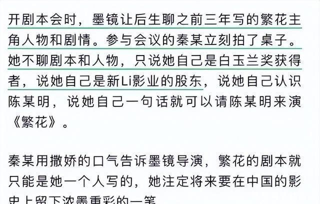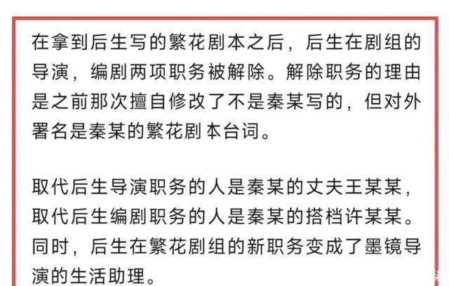如果他的说法真实,那其实是王家卫忽略了这一职业的边界,让他做了很多超过助理范畴的事情,而且还不用付更多的钱。 他说自己去采访很难报销,也是因为以他的职位而言,就不该有这个报销类目。 包括他提到,秦雯想要独占繁花剧本的署名权,那也是要得到王家卫默认的啊。