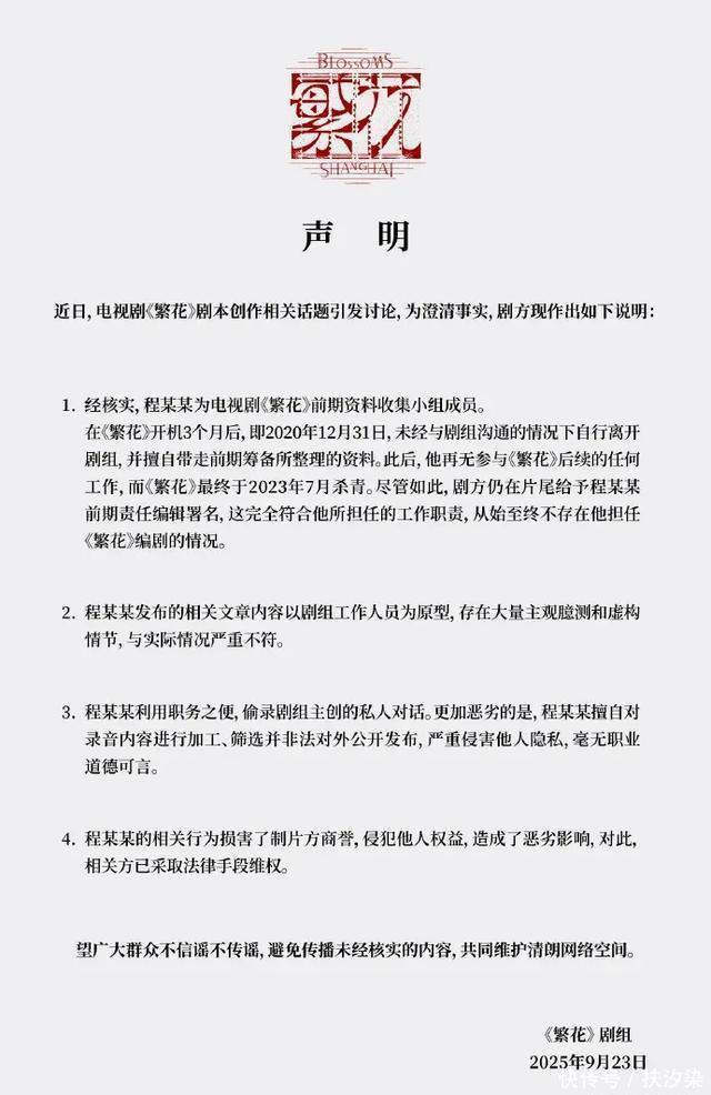 声明里提到的“程某某”,就是这次舆论的爆料人“古二”, 自称是繁花最初的编剧。